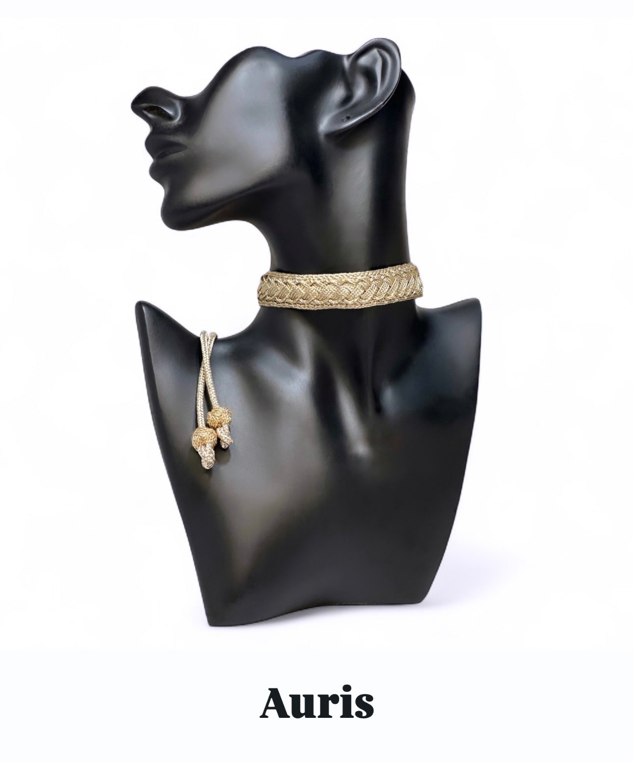 Auris is ancestral light, elevated in gold. from high-density golden sfifa and skalli, this choker balances precise braiding with graceful flow. Its subtle glow graces the neck with regal modernity. Made for radiant women who carry strength in stillness.