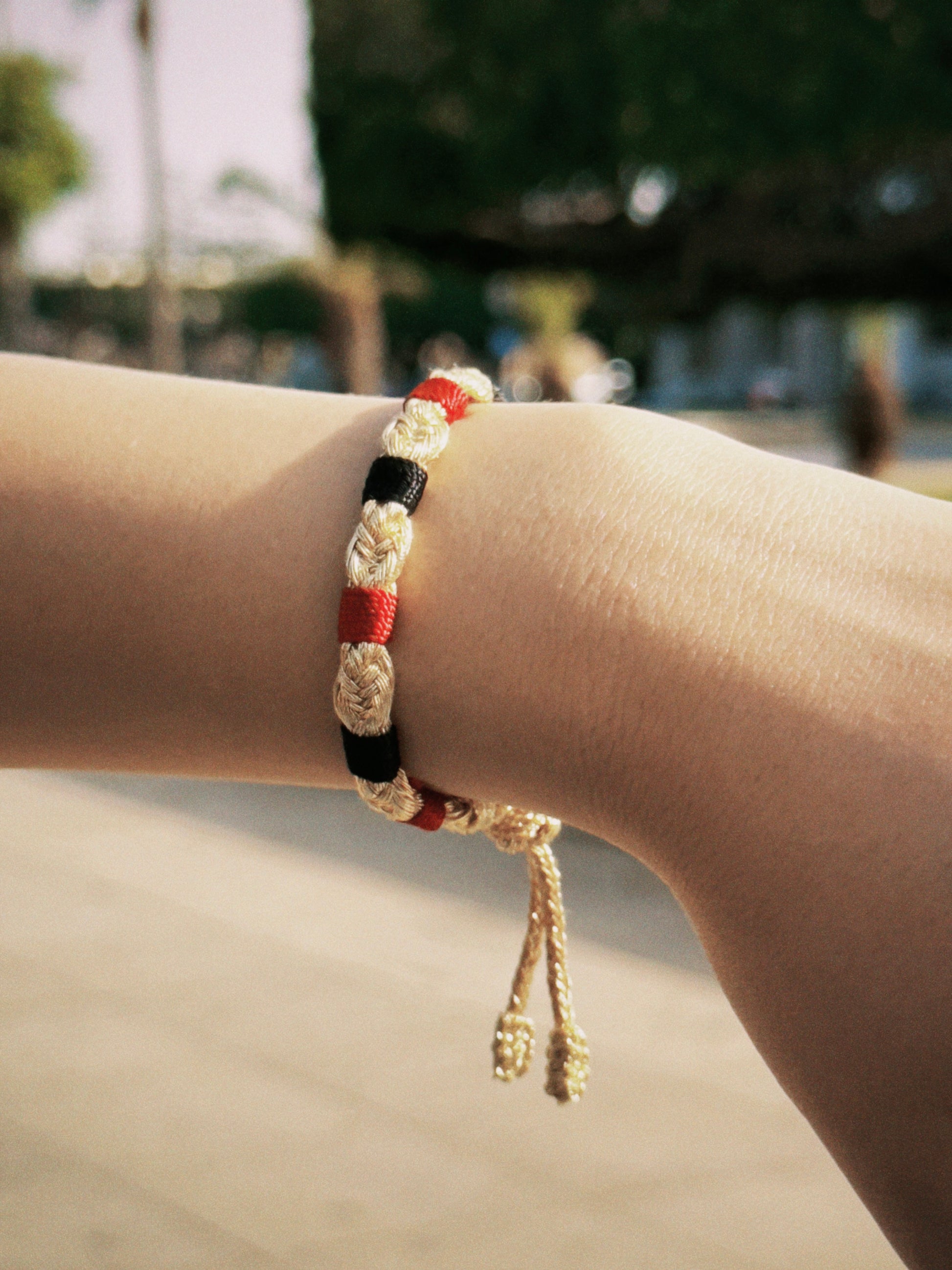 Widad, c’est la passion maîtrisée, l’élégance incarnée. Tissé à la main en sfifa rouge profond et skalli doré, ce bracelet rend hommage à l’amour noble, discret et éternel.