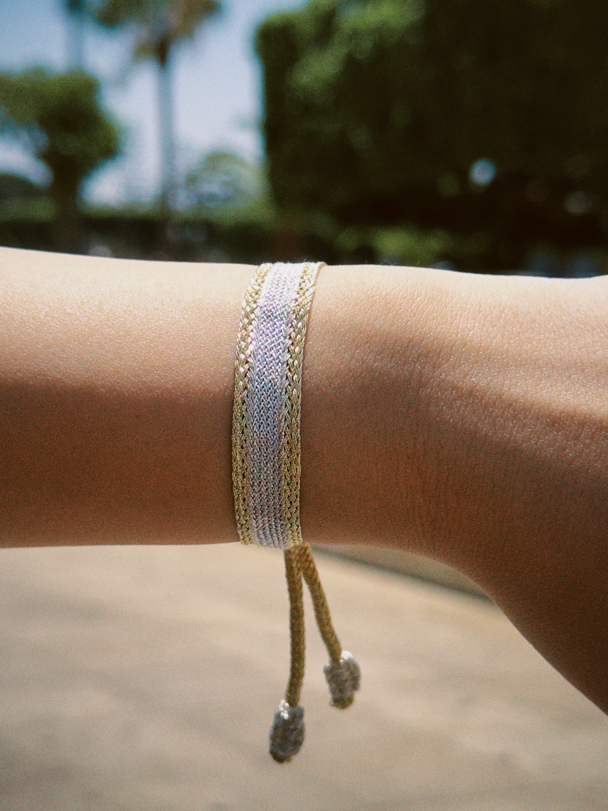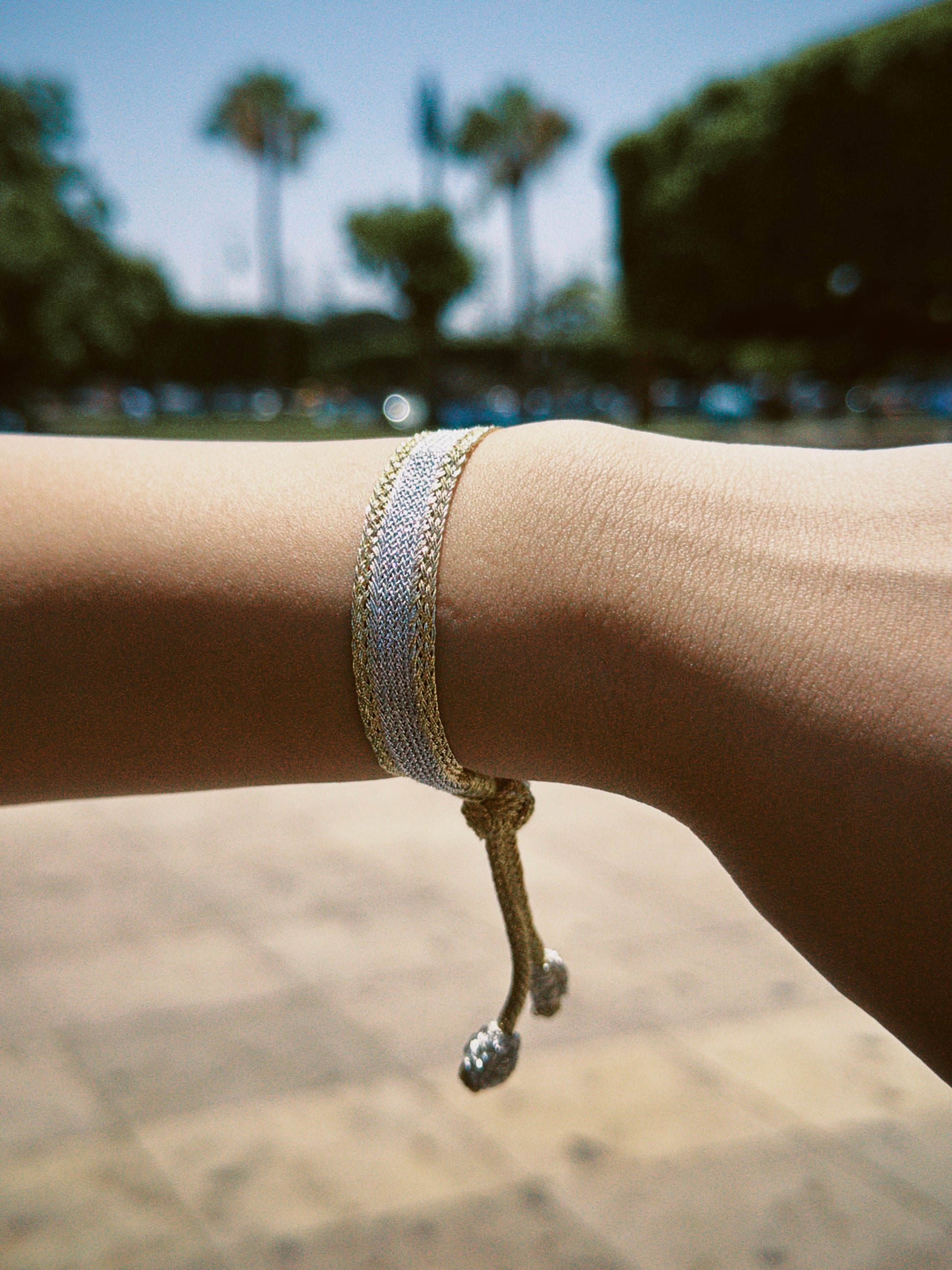A subtle, modern glow. Faezah blends gold and white sfifa into an elegant braid, creating a refined, lightweight, and adjustable bracelet. A luminous piece to wear solo or stacked.